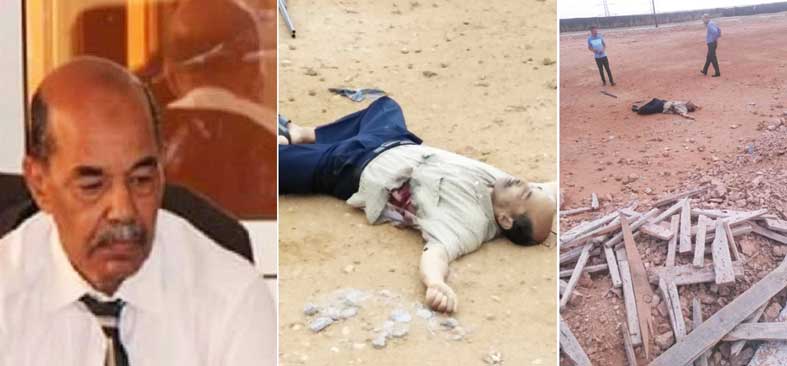لنعد إلى مسرح الحادث وتوقيته ومكوناته.. الساعة التاسعة صباحا من يوم الاثنين 22 يوليوز 2019، بتجزئة الضحى، وعلى ضفة وادي الساقية الحمراء بالعيون، حلت عناصر الشرطة العلمية والتقنية رفقة ممثل النيابة العامة وعدد كبير من المسؤولين الأمنيين بالمنطقة، ووقفت سيارات الأمن قريبة من مسرح الحادث، جثة شخص في الخمسينيات من عمره، يرتدي قميصا وسروالا مرميا على ظهره، وجرح غائر على جنبه الأيسر، وعلى بعد أقل من متر من رجليه بندقية صيد مرمية، كان يستعملها الراحل في جولات القنص، وعلى بعد امتار قليلة كانت سيارة الخدمة متوقفة قرب الجثة؛ فالراحل كان يتولى، قيد حياته، قيادة الحكونية بإقليم طرفاية، ويقطن بمدينة العيون.