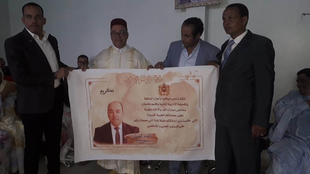 تم تكريم قائد المقاطعة الثانية بمدينة طانطان مساء يوم الخميس من طرف أعوان السلطة في حفل توديع قائد المقاطعة الذي تم تعيينه كقائد ممتاز بمدينة المحمدية،هذا التكريم الذي يعد الأول من نوعه بسلك الداخلية بمدينة طانطان و ذلك نتيجة سلوك هذا الرجل و تعامله مع الشأن المحلي و أعوان السلطة بشكل حضاري،هذا في الوقت الذي تم تعيين خليفته مكانه كقائد بالنيابة الذي يعد أحد الأبناء البررة.