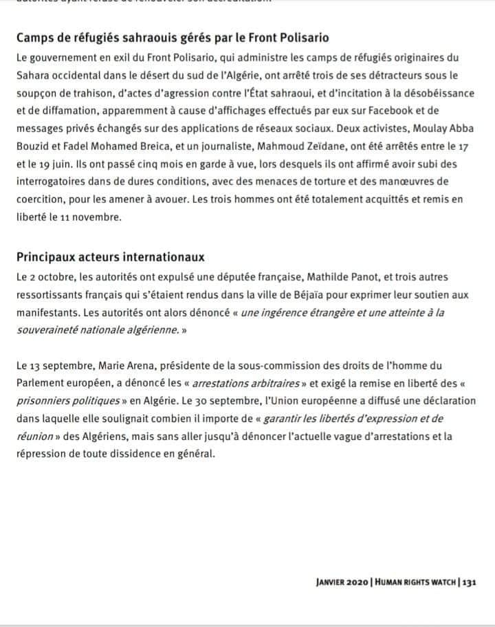 تطرق منظمة هيومن رايتش وتش في تقريرها السنوي إلى واقع حقوق الانسان في مخيمات الصحراويين بتندوف جنوب الجزائر حيث وصفت تقريرها الوضع الحقوقي بالمتدهور كما أشارت المنظمة في تقريرها السنوي إلى إعتقال قيادة البوليساريو إلى ثلاثة أشخاص يعتبرون من منتقيديها لها تحت ذريعة الخيانة، و أعمال العدوان ضد قيادة البوليساريو والتحريض على العصيان والتشهير بسبب منشورات على Facebook والرسائل المتبادلة على تطبيقات الشبكات الاجتماعية، و يتعلق الأمر بكل من الناشط فاضل محمد بريكة و أبا بوزيد ، وصحفي يدعى محمود زيدان ، حيث قُبض عليهما في الفترة من 17 إلى 19 يونيو 2019. وأمضو خمسة أشهر في الحجز (سجن الذهيبية)، و قد تم استجوابهم في ظل ظروف قاسية ، مع التهديدات و التعذيب والإكراه ، لحثهم على الاعتراف ، تم تبرئة الرجال الثلاثة وإطلاق سراحهم بالكامل في 11 نوفمبر 2019.