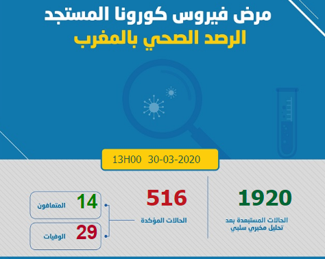 في حصيلة جديدة للوضعية الوبائية، كشفت البوابة الرسمية لفيروس كورونا بالمغرب، أن عدد الوفيات بلغ 29 إلى حدود الساعة الواحدة ظهرا، بينما ارتفع عدد الحالات المتماثلة للشفاء 14 حالة، بعد زيادة حالة واحدة منذ الحصيلة التي أعلن عنها صباح اليوم على الساعة الثامنة. ولم تسجل أي حالة جديدة منذ الحصيلة المعلن عنها صباح اليوم، والتي تحدثت عن 516 إصابة مؤكدة.