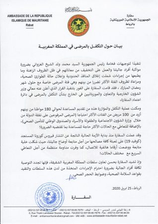 أشادت السفارة الموريتانية بما قالت إنه «حسن تعاون سلطات المملكة المغربية الشقيقة»، قبل أن توصي كافة أفراد الجالية بضرورة «احترام الإجراءات المتخذة من لدن هذه السلطات والتقيد بقواعد السلامة الصحية وضوابط الحجر الصحي».