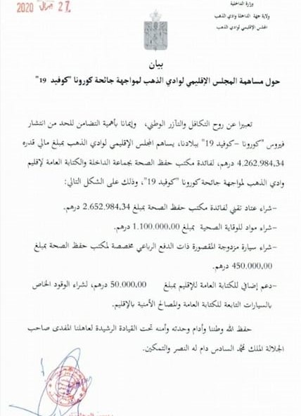 نشر بعض المهتمين بالشأن بلاغ صادر عن المجلس الإقليمي لمدينة الداخلة يؤكد صرف ما قيمته 4.262.000,00 درهم لفائدة مكتب ضبط الصحة بجماعة الداخلة و الكتابة العامة لإقليم وادي الذهب من أجل مواجهة جائحة كورونا، و قد فصل البلاغ الصادر عن المجلس و في هذا السياق تساءل العديد من هؤلاء متتبعي الشأن المحلي بجهة الداخلة عن الطريقة التي إعتمدتها بعض المجالس بجهة الداخلة في تمرير بعض الصفقات باسم جائحة كورونا، و بالخصوص المجلس الإقليمي الذي فصل من خلال بلاغه المبلغ الذي خصصه لهذه الجائحة على الشكل التلي: شراء عتاد تقني بقيمة 2.650.000,00 درهم ، شراء مواد للوقاية الصحية ب 1.000.000,00 درهم ، شراء سيارة ذات الدفع الرباعي مخصصة لكتب حفظ الصحة بقيمة 450.000,00 درهم، دعم إضافة للكتابة العامة للإقليم بمبلغ 50.000,00 درهم لشراء المحروقات. تلكم كانت بإيجاز شديد مصاريف جائحة كرونا بالنسبة للمجلس الإقليمي لمدينة الداخلة، هذا المقتنيات التي فكك شفرتها بعض من المتتبعين بقوله بأن شراء سيارة للدفع الرباعي في مدينة لا تتجاوز مساحتها حوالي 30 كلم طولا و12 عرضا وداخل مدار حضاري، كما طالبت ذات المصادر بالكشف عن العتاد التقني كما طالب هؤلاء من وزارة الداخلية، وعبر المديرية العامة للجماعات المحلية بضرورة فتح تحقيق في هذه الصفقة والطريقة التي تم تمريرها بها.