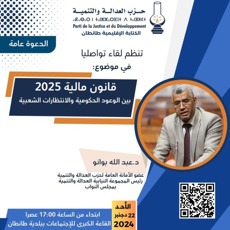 وفي هذا الإطار ،ولتقريب المواطنين ملاحظات وانتقادات الحزب لقانون المالية ،يستضيف فرع حزب العدالة والتنمية بإقليم طانطان،الدكتور عبد الله بوانو ،في لقاء تواصلي مساء يوم الأحد 22 دجنبر 2024، ابتداءً من الساعة الخامسة، بمقر بلدية طانطان، تحت شعار “قانون مالية 2025: بين الوعود الحكومية والانتظارات الشعبية”.