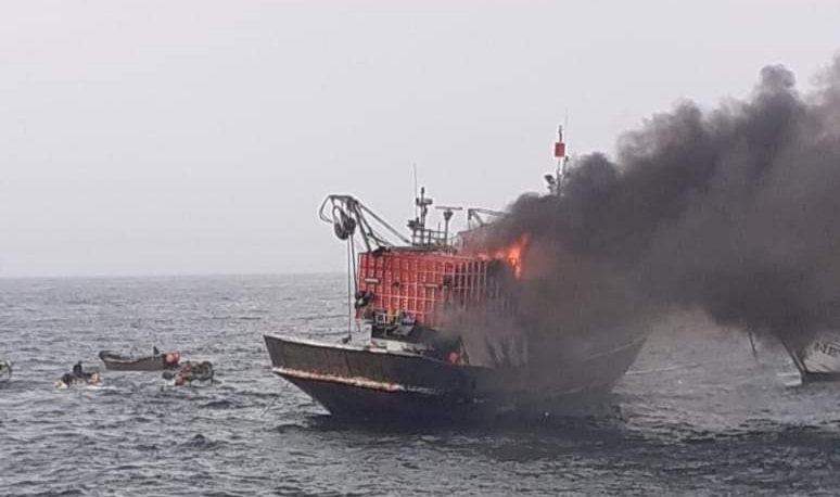 النار تلتهم مركب للصيد الساحلي بعرض سواحل العيون