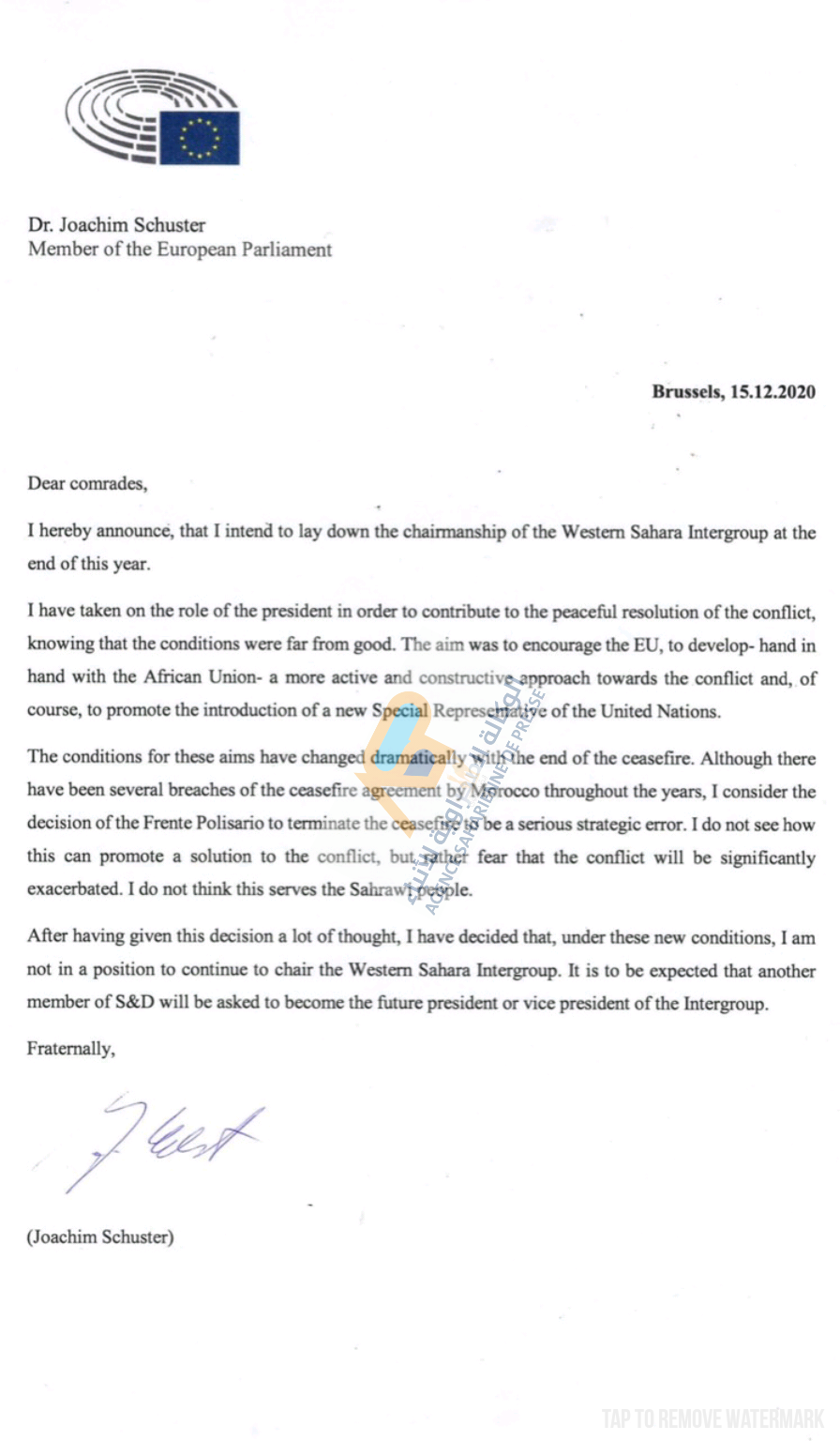 قدم السيد ” Dr Joachim Schuster ” إستقالته من رئاسة ما يسمى أصدقاء الصحراء الغربية بالإتحاد الأوربي، وحسب ما جاء في الإستقالة بأن سببها يعود إلى ما أسماه صاحبها بالخطأ الإستراتيجي لجبهة البوليساريو بمعبر الكركرات وعودتها لحمل السلاح .