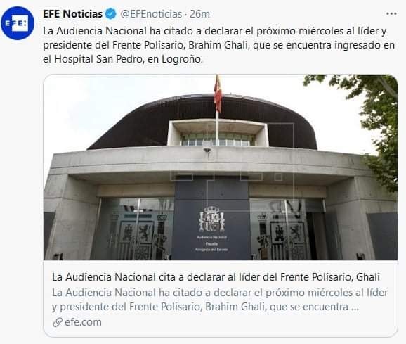 أكدت قصاصة وكالة الانباء الاسبانية الرسمية، أن إبراهيم غالي مطلوب للمثول يوم 5 مايو أمام القضاء الإسباني في قضية رفعها الفاظل ابريكة بسبب سجن الجبهة له ونشر صور زوجته في مواقع تابعة للجبهة. و أضاف المصدر بأن هناك خمسة مسؤولين بقيادة البوليساريو مطلوبين هم بدورهم للمثول أمام القضاء الإسباني و هم: سيد احمد البلال الملقب ب (البطل) و ذلك يوم 5 ماي 2021 على الساعة العشرة و 15 دقيقة، بالإضافة إلى غالي سيدي محمد عبد الجليل المعروف بإبراهيم غالي، و ذلك يوم 5 ماي على الساعة العاشرة و النصف، كما ذكر المصدر كذلك البشير المصطفى السيد الذي هو بدوره مطلوب للمثول أمام القضاء نفس اليوم على الساعة العاشرة و خمس و أربعون دقيقة، و المدعو محمد الخليل، الذي وجهت له دعوى للحضور أمام القضاء يوم 7 ماي على الساعة العاشرة و الربع، بالإضافة إلى السالك عبد الصمد “بولسان” الذي هو بدوره مطلوب للحضور يوم 7 ماي على الساعة العاشرة و النصف. و للإشارة فإن جل الذين وجه لهم القضاء دعوى للمثول أمام لا يوجدون على التراب الإسباني ما عدى (إبراهيم غالي) و “بولسان”.كما أن بعض ممن يسمون أنفسهم مناضلي الجبهة قد دعوا لتشكيل فريق محاميين للدفاع عن رئيسهم إبراهيم غالي المتهم بإرتكاب جرائم في حق الإنسانية بالمخيمات.