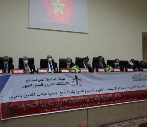 نظمت هيئة المحامية لدى محكمة الاستئناف بأكادير گلميم والعيون بشراكة مع جمعية هيئات المحامين بالمغرب، ندوة علمية حول موضوع “الآثار القانونية والسياسية للإعتراف الدولي بمغربية الصحراء”، يوم الثلاثاء، بقاعة الإجتماعات بغرفة الفلاحة بالداخلة، وذلك بحضور، وزير العدل، و والي جهة الداخلة واداي الذهب، و رئيس مجلس الجهة، والمنتخبين وفعاليات المنظومة القضائية بالمنطقة، والسادة المحامين، وممثلي وسائل الاعلام الجهوي والوطني.