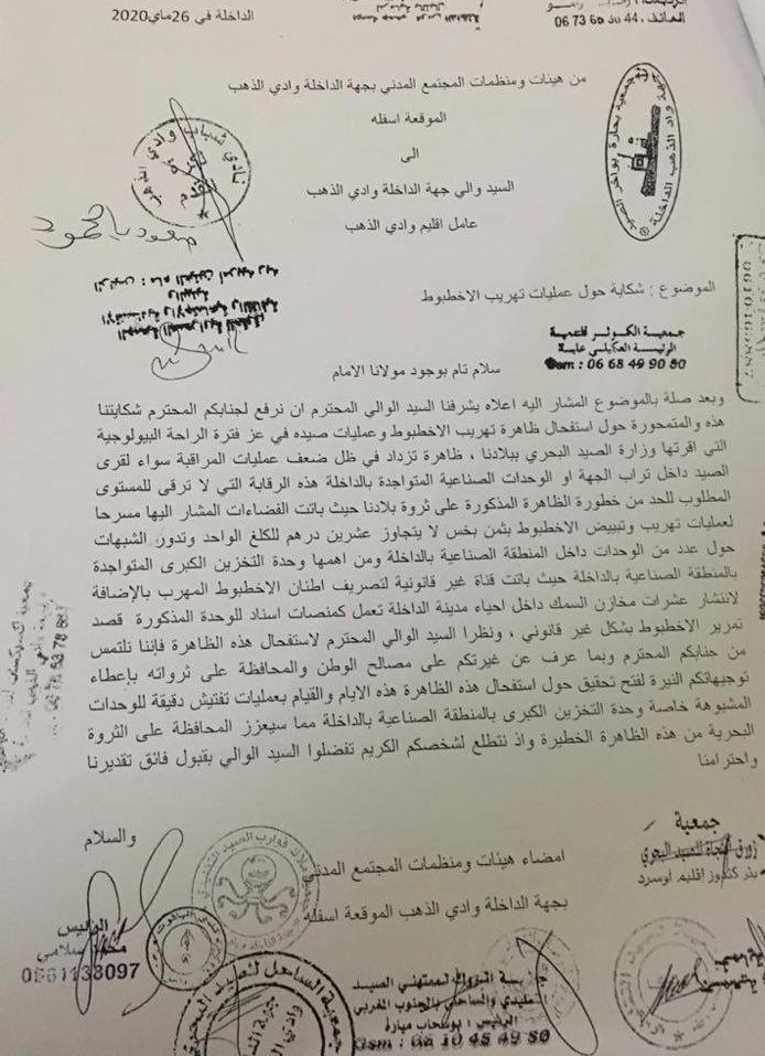 كما وصفت هذه الجمعيات من خلال رسائلهم التي يتوفر الموقع على نسخ منها بالتحايل عبر إستقبال المنتوج البحري داخل محلات منتشرة بالإقليم ووضعها كمنصات إسناد لشركته بالمنطقة الصناعية، مستغلا بذلك ضعف الاجهزة الامنية في مراقبة نقط الصيد أو ما يعرف بقرى الصيد التقليدي، نتيجة إدعاء صاحب الوحدة الصناعية الاكبر بالداخلة بعلاقاته بالمسؤول الأول عن الجهة.