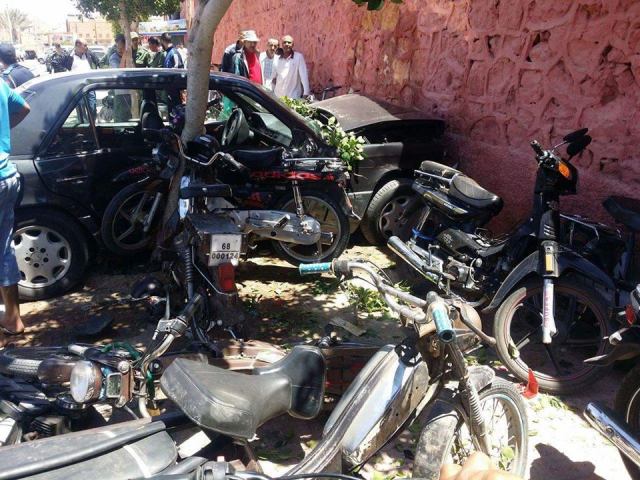 خلف إنحراف سيارة من نوع “رونو” كانت تسري بسرعة مفرطة حسب مصدر الجريدة عن مسارها و الاصطدام بمجموعة من الدرجات النارية كانت مركونة بمكان خاص بها بشارع البحرية، والتي تعود ملكيتها إلى عدد كبير من العاملين في سلك الجندية، هذا الإصطدام الذي حلف خسائر مادية على مستوى الدراجات كما تحدث مصادر أخرى عن إصابات على مستوى العاملين بالإدارة العسكرية التي إصطدمت السيارة بسورها،و قد خلف هذا الحادث حالة إستثناء كبيرة نتيجة شدة الإصطدام و الصوت الذي خلفه كما هرعت إلى عين المكان كل الأجهزة الأمنية لكون حساسية المكان،كما أرعب الإصطدام خوف كبير عند الساكنة التي هي بدورها تجمهرت حول الحادث لمعرفة أسبابه،و لم يذكر المصدر أسباب الحادث.