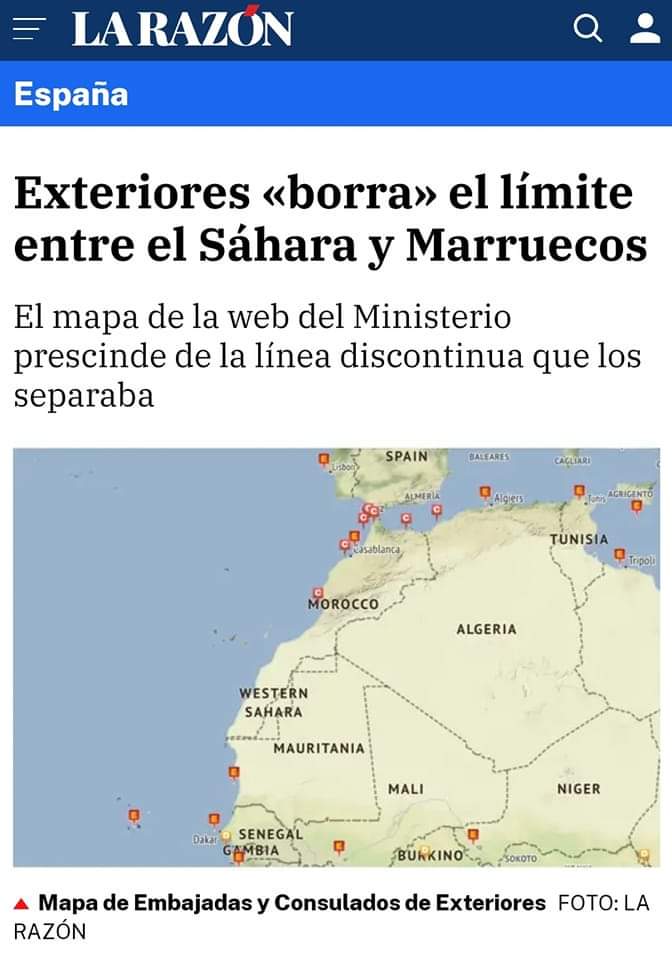 قالت صحيفة “لارثون” الإسبانية أن الموقع الإلكتروني لوزارة الخارجية الإسبانية، قد نشر خريطة المغرب كاملة غير مبتورة، هذه الخطوة جاءت بعد اللقاء الذي جمع رئيس الحكومة الإسبانية بالملك محمد السادس يوم الخميس.