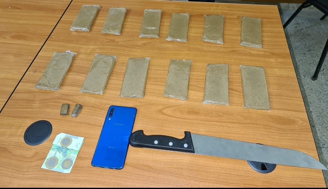 تمكنت فرقة من مكافحة العصابات التابعة للشرطة القضائية بولاية أمن العيون، يوم الثلاثاء، من توقيف أحد الأشخاص يبلغ من العمر 34، بعدما تم إعداد كمين لهذا الأخير بحي الوحدة، وهو متلبسا بحيازة كمية من مخدر الشيرا موجهة للترويج، ومبلغ مالي، وهاتف نقال يستعين به في عملية الترويج، وفي اليوم الموالي تم تفتيش منزل ثانوي خاص بالموقوف، أسفرت عالعملية عن حجز مجموعة من صفائح مخدر الشيرا، حيث بلغ وزنها 1045 غراما، بالإضافة إلى سكين من الحجم الكبير.