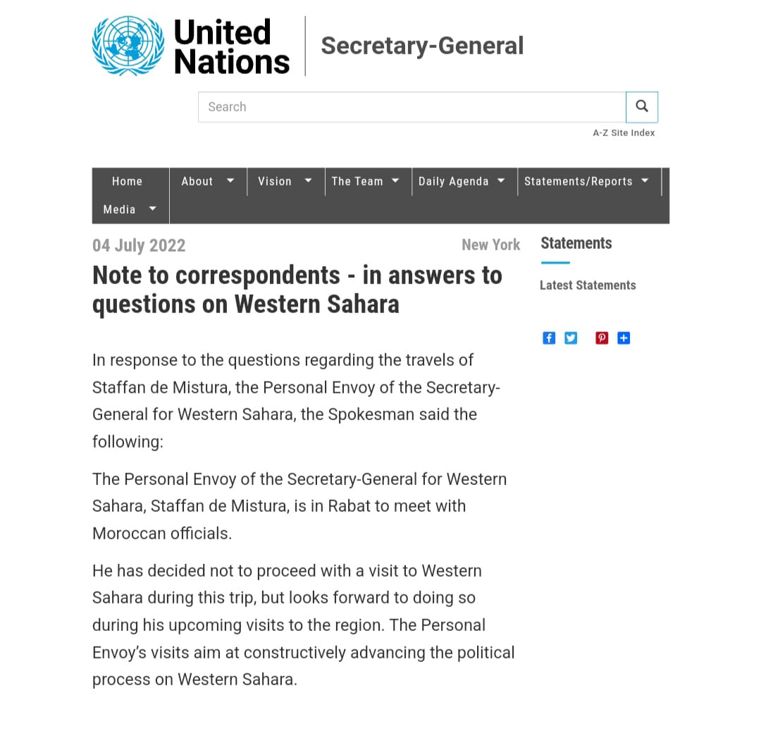 أكد مصدر جد مطلع أن الأمانة العامة للأمم المتحدة، قد عبرت عبر المتحدث الرسمي لها من خلال قصاصة تم نشرها على موقع الأمم المتحدة الإلكتروني الرسمي، تجيب على أسئلة مراسلين صحفيين، تساءلوا عن عن قضية الصحراء، وردا على أسئلتهم التي كانت تهم سفر المبعوث الشخصي للأمين العام للصحراء “ستافان دي ميستورا” يؤكد الموقع أن وصل المبعوث الأممي إلى الرباط، كان من أجل لقاء مسؤولين مغاربة وأنه قد قرر عدم المضي قدمًا في زيارة للصحراء، خلال هذه الرحلة لكن المبعوث الأممي يتطلع إلى القيام بذلك خلال زياراته القادمة إلى المنطقة التي تهدف إلى دفع العملية السياسية في الصحراء بشكل بناء.