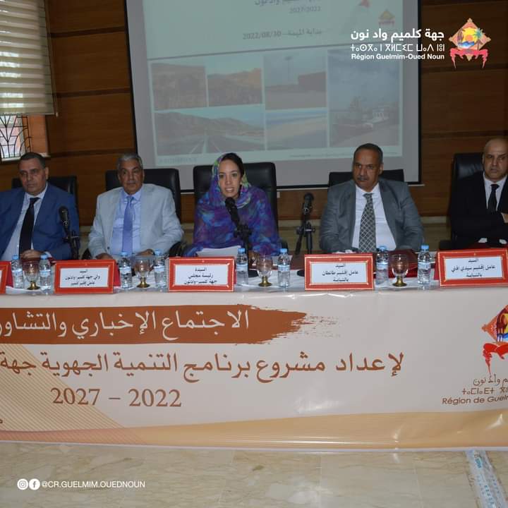 إستعرضت رئيسة جهة گلميم واد نون، اليوم الثلاثاء، بقاعة الإجتماعات بمقر الجهة،اجتماعاً اخبارياً وتشاوري لإعطاء إنطلاقة إعداد برنامج التنمية الجهوية لجهة كلميم وادنون للفترة 2022-2027، وذلك بحضور والي الجهة وعمال والكتاب العامين لأقاليم الجهة ورؤساء المصالح الجهة والمنتخبين.