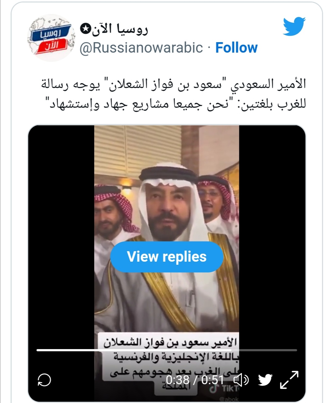 تداول نشطاء تواصل اجتماعي، مقطعاً “للأمير” سعود بن فواز الشعلان، وهو مُقرّب من ولي العهد السعودي الأمير محمد بن سلمان، وظهر الشعلان يتحدث باللغة الإنجليزيّة، والفرنسيّة بشكل مُتحدّي، مُخاطبّاً كل من يُهدّد بلاده السعوديّة.