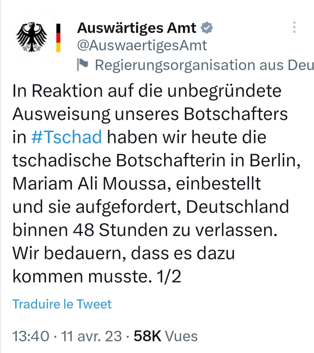 وقالت وزارة الخارجية الألمانية في تغريدة على تويتر اليوم، إنهم استدعوا السفيرة مريم علي موسى، بعد طرد تشاد لسفيرنا بدون الإستناد إلى مبررات حقيقية، وأخبرناها بقرار إمهالها 48 ساعة لمغادرة البلاد.