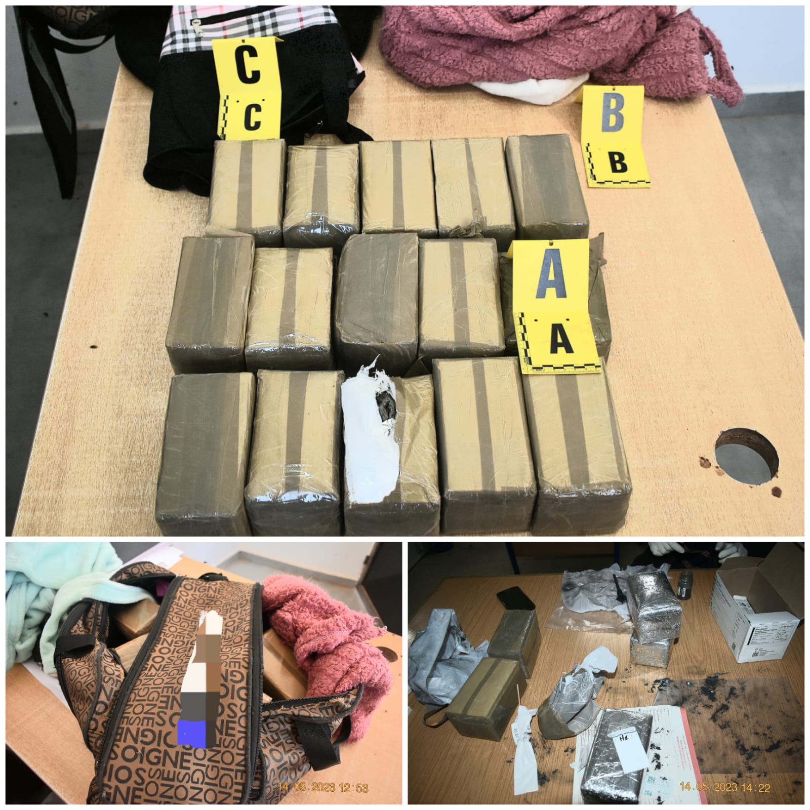 التي عثر بحوزتها 15 رزمة من مخدر الشيرا بلغ مجموع وزنها حوالي 15 كيلوغراما، التي وجدت داخل أمتعة الموقوفة، وذلك بالإستعانة بالكلاب المدربة للشرطة.