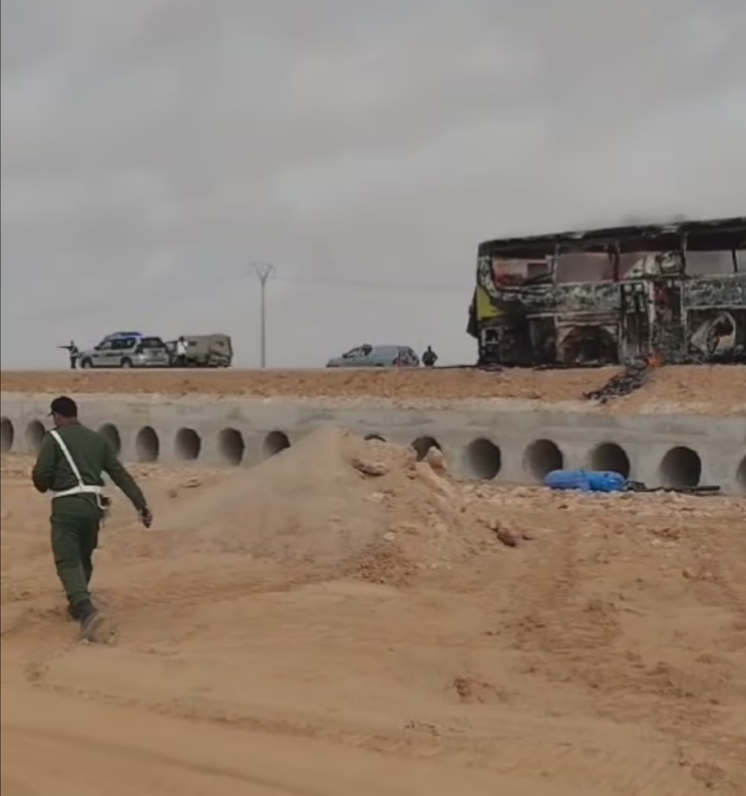 شبت النار في حافلة على الطريق الوطنية رقم 1 الرابطة بين جماعة أشبيكة وبلدية الوطية التي تبعد عن مكان الحادث بحوالي 30 كلم جنوبا، وحسب مصدر الموقع فإن الحافلة كانت في طريقها إلى المعبر الحدودي الگرگرات، متوجهة إلى
