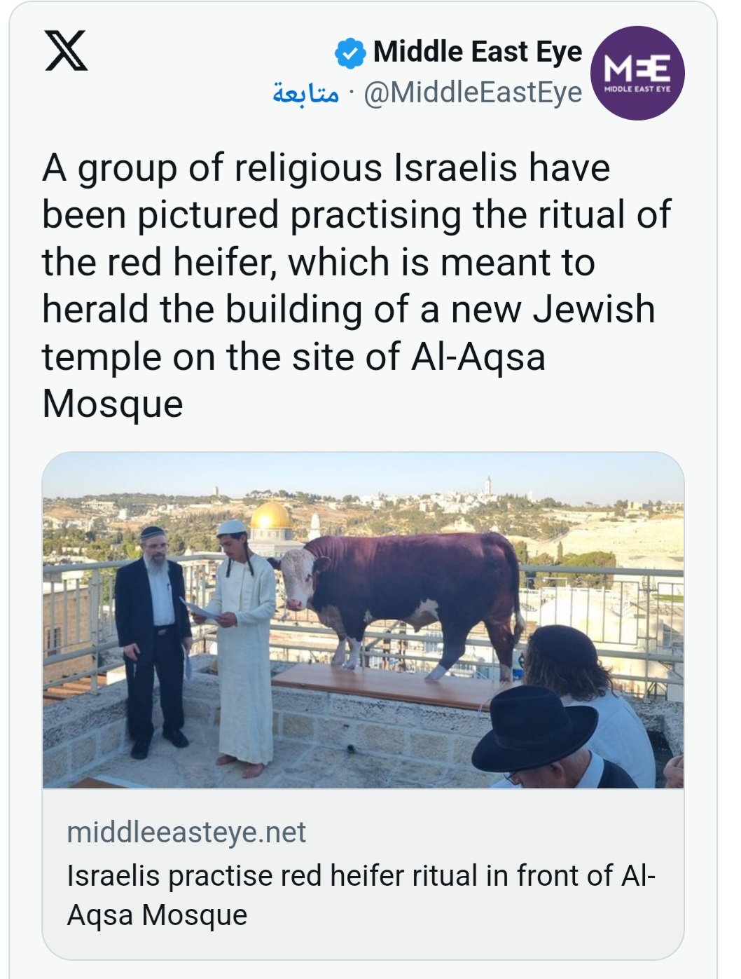 ويوضح تقرير الموقع البريطاني، أن رماد البقرة الحمراء شرط لبناء معبد يهودي ثالث في القدس. وتقول الجماعات اليهودية المتطرفة إن هذا المعبد يجب أن يتم بناؤه على الهضبة المرتفعة في مدينة القدس القديمة، حيث يقع المسجد الأقصى ومصلى قبة الصخرة.