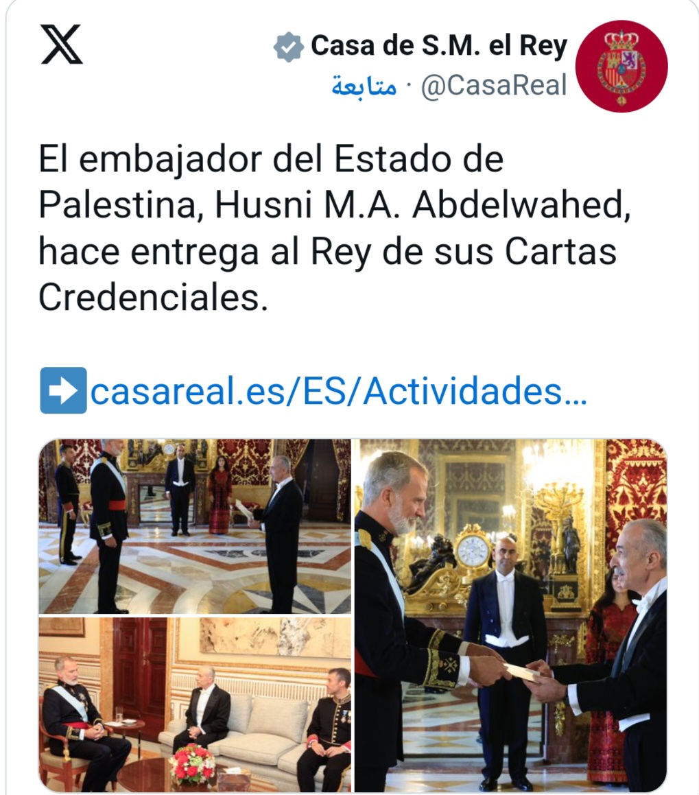 إستقبل العاهل الإسباني، يوم أمس الإثنين السفير عبد الواحد في القصر الملكي بمدريد، حسني عبد الواحد، كأول سفير لدولة فلسطين في إسبانيا، بعدما إعترفت بها مدريد في مايو الماضي، حيث جرت مراسم تسليم أوراق الإعتماد، بحسب مشاهد بثها الديوان الملكي على منصة X.