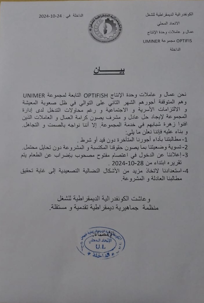 طالب عمال وعاملات وحدة للإنتاج OPTIFIS مجموعة UNIMER (إتحاد صناعات البحر ) بالداخلة، التابعين لنقابة الكونفدرالية للشغل، الذين لم يتوصوا بمستحقاتهم، مند شهرين، بضرورة صرف أجورهم نظرا لإلتزاماتهم الأسرية، والإجتماعية في ظل صعوبة المعيشة حسب البيان الذي يتوقع الموقع على نسخة منه، كما طالب أصحاب البيان بتسوية وضعيتهم بما يصون حقوقهم المادية دون تحايل، كما أعلن أصحاب البيان دخولهم في إعتصام مفتوح، مصحوب بإضراب عن الطعام إبتداء من 2024/10/28 .