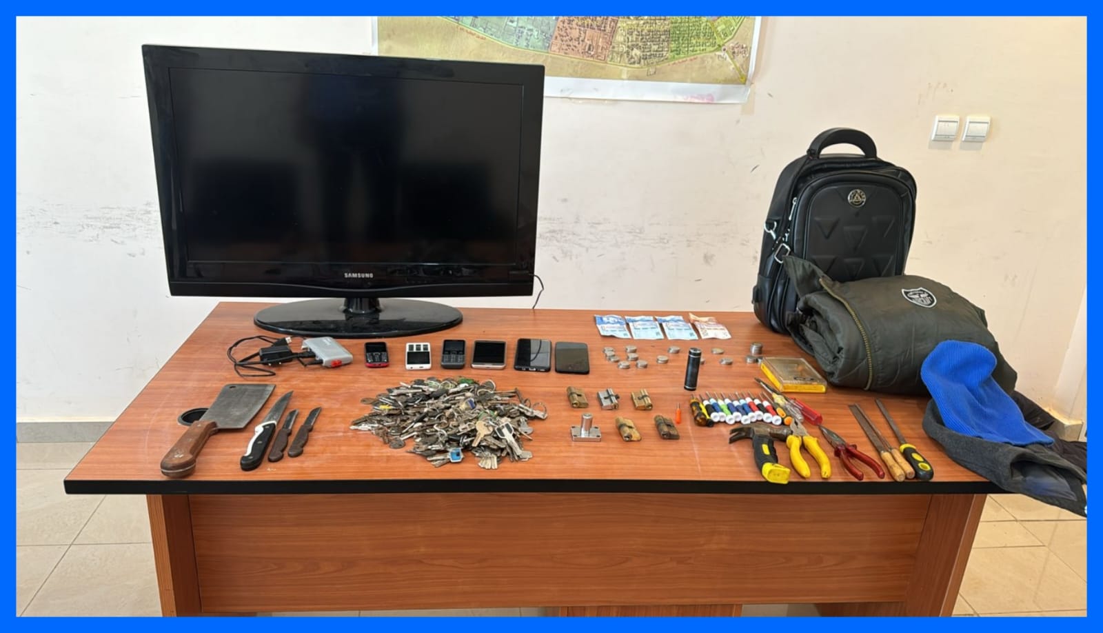 بناء على ذلك قامت مختلف المصالح الامنية بالمفوضية بتكثيف أبحاثها وتحرياتها، مكنتها من تحديد هوية المشتبه فيه وتوقيفه بحي النهضة بالمرسى، الذي ضبط لديه بعض المنقولات المتحصلة من السرقة، وهي عبارة عن ستة هواتف محمولة، وجهاز تلفاز مسطح، علاوة على مبلغ مالي، كما تم حجز مجموعة كبيرة من المفاتيح والأقفال، فضلا عن مجموعة من الأدوات التي يشتبه في إستعمالها في تنفيذ هذه العمليات الإجرامية.
