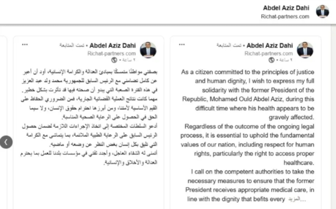 الوزير الموريتاني السابق دعا السلطات المختصة فى بلاده إلى اتخاذ الإجراءات اللازمة لضمان حصول الرئيس السابق على الرعاية الطبية الملائمة، بما يتماشى مع الكرامة التي تليق بكل إنسان بغض النظر عن وضعه أو ماضيه.