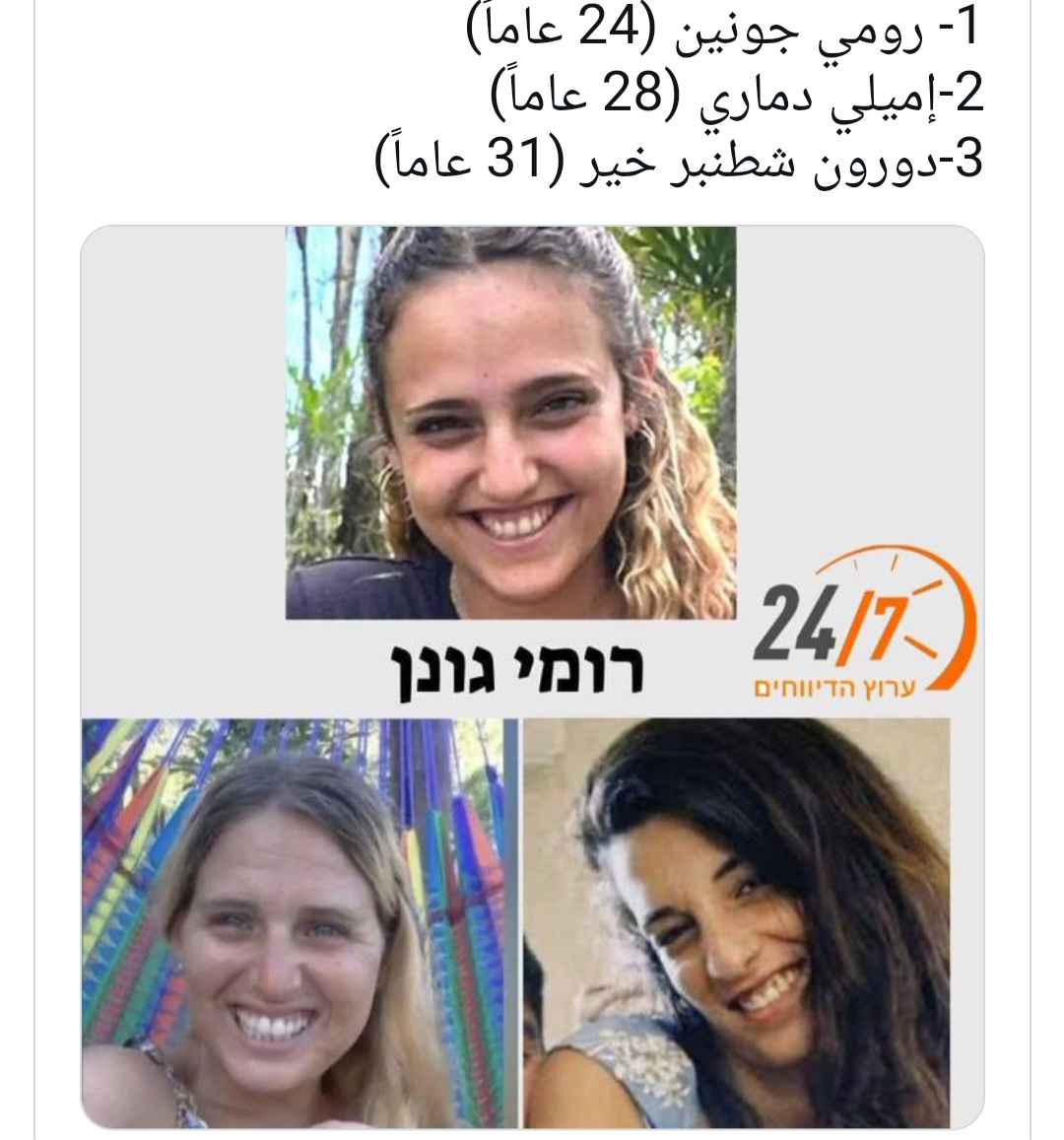 كشف المتحدث باسم كتائب القسام، أبو عبيدة، أنه في إطار صفقة تبادل الأسرى، سيتم الإفراج عن 3 أسرى إسرائيليين هم: رومي جونين 24 عاما وإميلي دماري 28 عاما ودورون شطنبر خير 31 عاما.