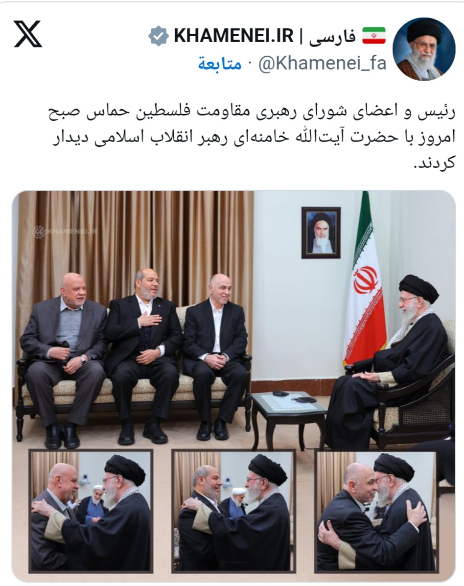 نشر المرشد الإيراني على حسابه الخاص بمنصة “إكس” صورا عن اللقاء الذي مجع المرشد الإيراني علي خامنئي صباح اليوم السبت في إيران وفدا من حركة حماس،المكون من رئيس مجلس شورى الحركة محمد درويش، والقياديين خليل الحية ونزار عوض الله.