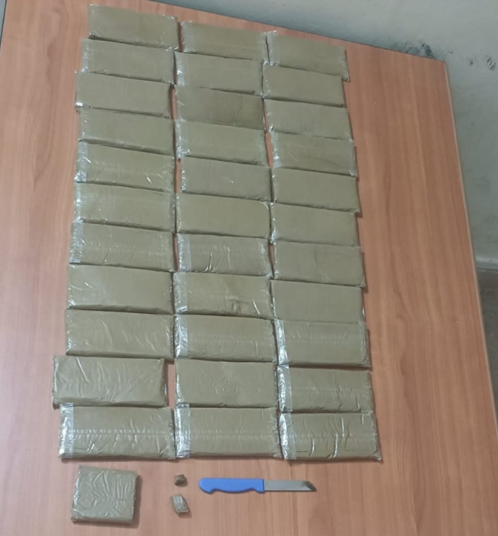 وقد أسفرت عمليات الضبط والتفتيش التي أجريت في هذه القضية عن حجز 33 صفيحة ونصف من مخدر الشيرا، بلغ مجموع وزنها كيلوغرامين و600 غرام، علاوة على سكين مخصص لتقطيع المخدر.