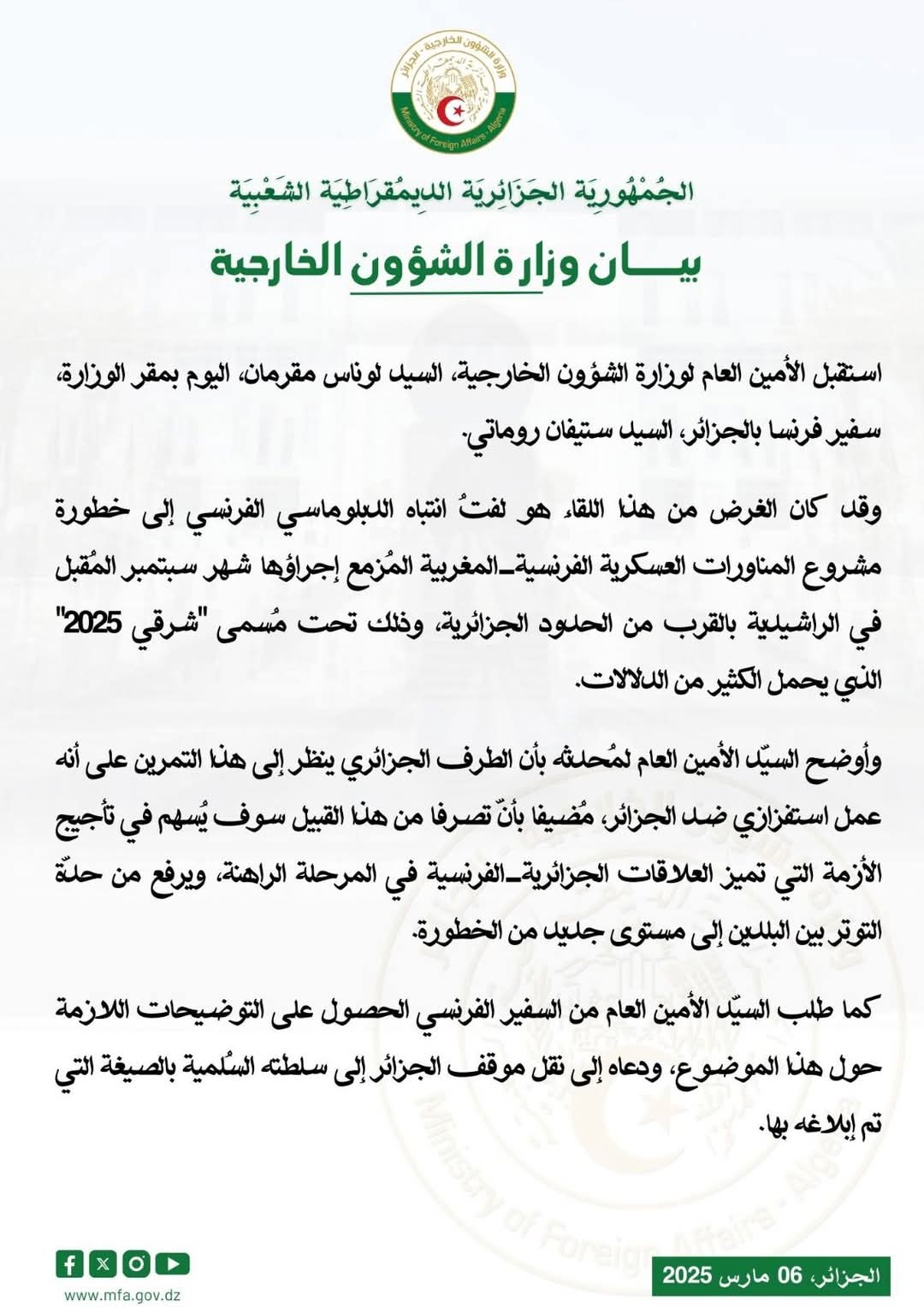 قال بيان صادر عن وزارة الشؤون الخارجية الجزائرية، أن الأمين العام للوزارة، لوناس مقرمان، إستقبل سفير فرنسا بالجزائر، ستيفان روماتي، بهدف لفت إنتباهه إلى خطورة مشروع المناورات العسكرية الفرنسية المغربية المزمع إجراؤها شهر شتنبر المقبل بالراشيدية، بالقرب من الحدود الجزائرية، تحت إسم “شرقي 2025″، الذي يحمل الكثير من الدلالات، على حد وصف البيان.