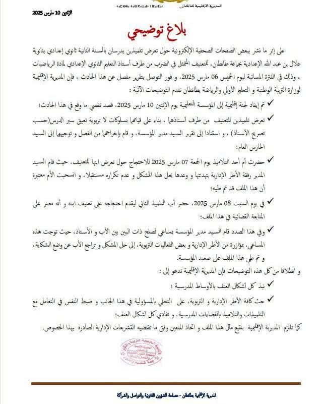 تفاعلت المديرية الإقليمية لوزارة التربية والتعليم الأولي والرياضة بالطنطان، مع ما تم نشره حول الإعتداء على تلميذين بإعدادية علال بن عبد الله، حيث قامت المديرية بتشكيل لجنة في موضوع التلميذين الذين تعرضا للعنف داخل فصل الدراسة من طرف أحد الأساتذة.