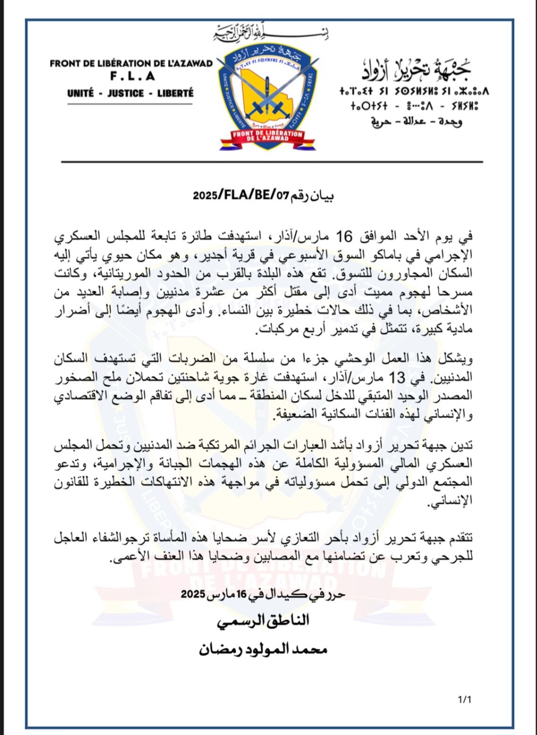 جبهة تحرير أزواد تصف هجوم اجدير بالعمل الوحشي