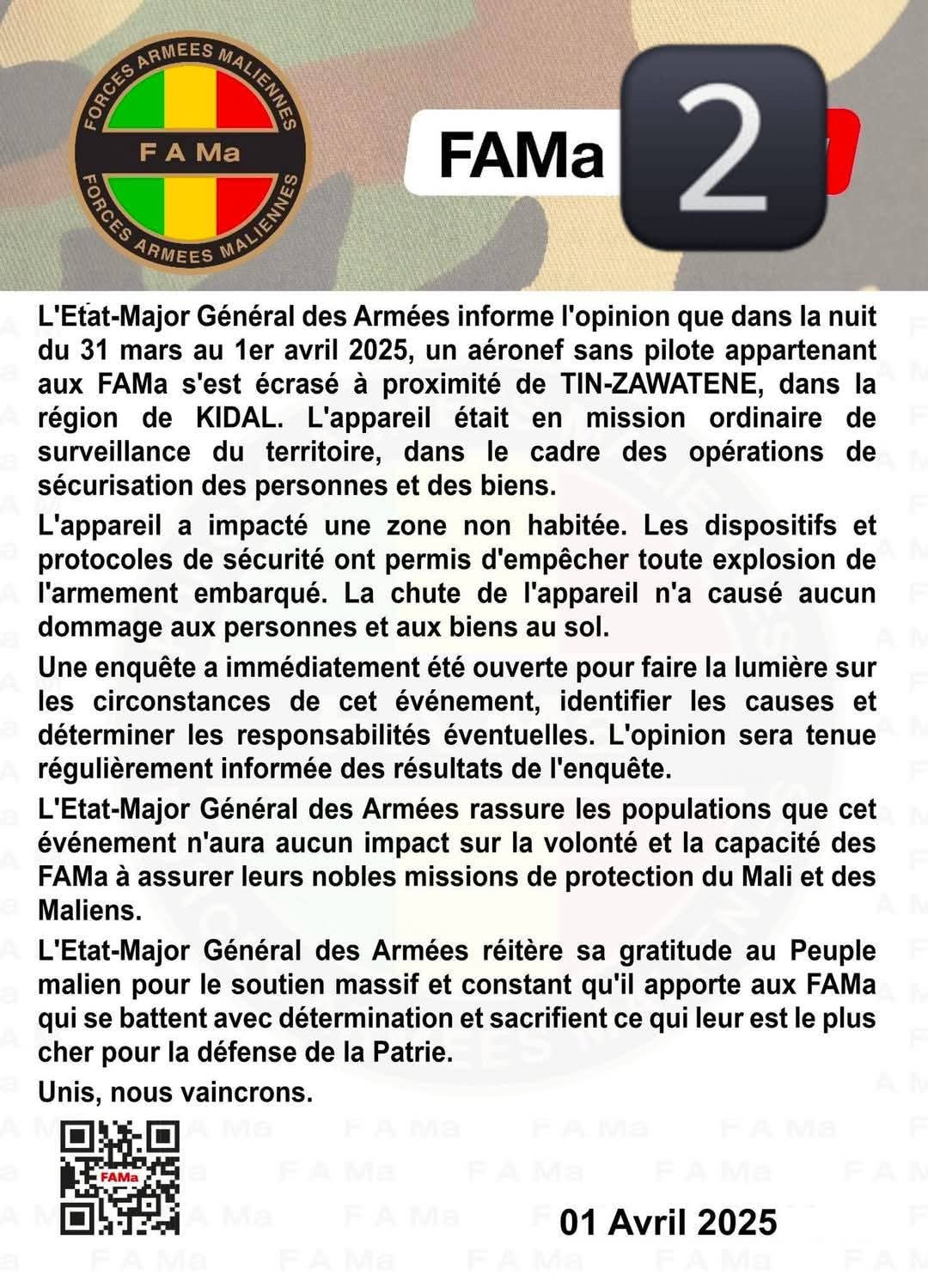 كما سارعت مالي إلى تجاهل رواية الجزائر، وأكدت على أن طائرة مسيرة تابعة لها سقطت نتيجة عطب فني في منطقة غير مأهولة، وأن أنظمتها الأمنية منعت انفجار حمولتها، وهذا الأمر مشكوك في صحته حسب خبراء عسكريين.