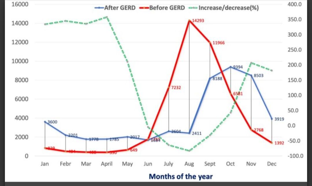 و في منشور على حسابه الرسمي على فيسبوك قال الوزير الاثيوبي: ازداد تدفق مياه النيل الأزرق خلال موسم الجفاف بأكثر من ثلاثة أضعاف في المتوسط، بينما شهدنا انخفاضا ملحوظا في الفيضانات وتأخيرها لأكثر من شهر”. وأضاف: “سجل التدفق اليومي لدينا يثبت ذلك عمليا.