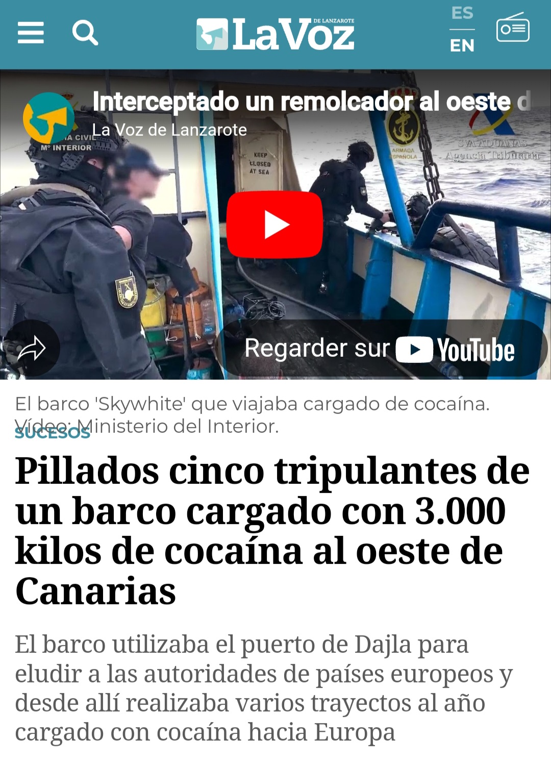نشر موقع “صوت لانزاروت” الناطق بالإسبانية، الصادر يوم الأربعاء، أنه تم إستخدام سفينة من ميناء الداخلة، من أجل التهرب من السلطات الدول الأوروبية، فقامت هذه السفينة بتهريب “الكوكايين” من خلال عدة رحلات إلى أوروبا. وحسب الموقع فإن توقيف هذه الشبكة قد شهد تعاون دولي بين أجهزة الشرطة في المغرب وفرنسا والولايات المتحدة والمملكة المتحدة والبرتغال، بالإضافة إلى هيئتي التنسيق CITCO وMAOC-N.