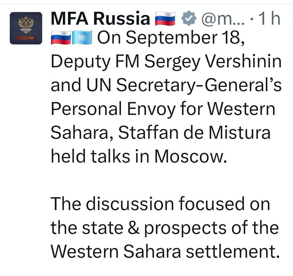 وحسب الحساب الرسمي لوزارة الخارجية الروسية على منصة X فإن المباحثات التي أجريت بين المبعوث الأممي ونائب وزير الخارجية الروسي قد ركزت على حالة وتوقعات تسوية قضية الصحراء الغربية بالإضافة إلى دور الأمم المتحدة في الجهود الرامية إلى إعادة إطلاق العملية السياسية الهادفة إلى تحقيق حل عادل ودائم ومقبول للجميع.