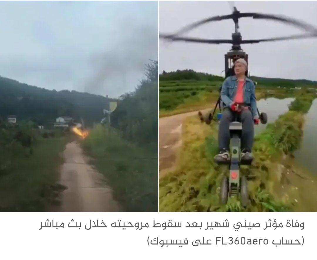 لقي المؤثر الصيني في مجال الطيران تانغ فيجي البالغ من العمر 55 عاما مصرعه أمام أنظار أكثر من ألف متابع، إثر سقوط طائرته الخفيفة واشتعالها في مشهد صادم بُث لحظة بلحظة عبر منصّة “دووين” .