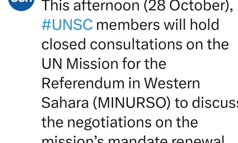 قرر مساء اليوم الثلاثاء 28 أكتوبر 2025 أعضاء مجلس الأمن الدولي، عقد جلسة مشاورات لم تكن مقررة سلفا خلف أبواب مغلقة فيما بينهم لمناقشة مسودة القرار الخاصة بتجديد ولاية بعثة المينورسو في نسختها الثانية التي تقدمت بها الولايات المتحدة الامريكية بعد أن خضعت لبعض التعديلات، ومن المحتمل أن يخضع التعديل مساء اليوم بسبب عدم موافقة روسيا وبعض أعضاء المجلس على فقرات وردت فيها وصفت بأنها لا تتماشى مع ميثاق الأمم المتحدة والقانون الدولي.