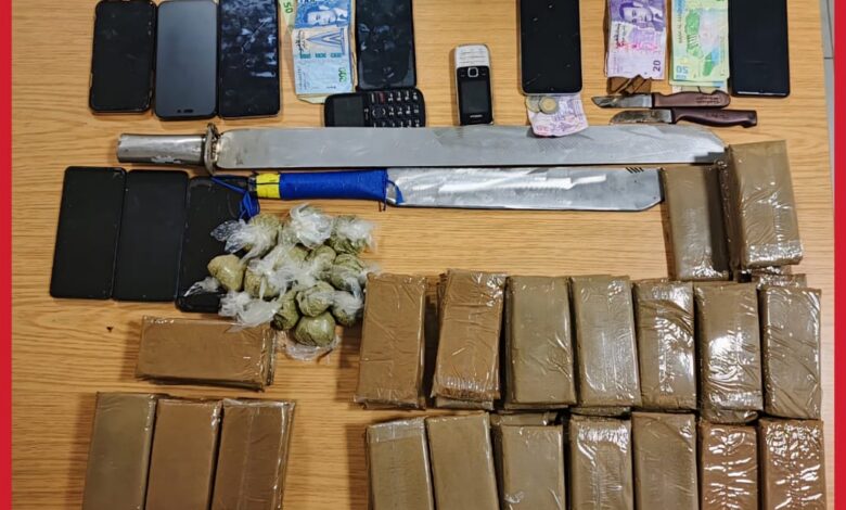 بناء على معلومات وفرتها مصالح المديرية العامة لمراقبة التراب الوطني، تم ليلة أول يوم أمس الأربعاء، تم توقيف 10 أشخاص من بينهم امرأة، يبلغون من العمر ما بين 18و31 سنة، من طرف فرقة للشرطة القضائية بالمنطقة الإقليمية للأمن بمدينة طانطان، تباعا بأحياء متفرقة بمدينة طانطان وكذا على مستوى جماعة بن خليل، حيث أسفرت عمليات الضبط والتفتيش عن حجز 95 صفيحة ومجموعة من قطع مخدر الشيرا، بلغ وزنها الاجمالي أزيد من 8 كيلوغرام ونصف، علاوة على سيارة ودراجتين ناريتين كبيرتي الحجم، فضلا عن مبالغ مالية يشتبه الحصول عليها من هذه الأنشطة الإجرامية، وكذا سكينين من الحجم الكبير وهواتف نقالة.