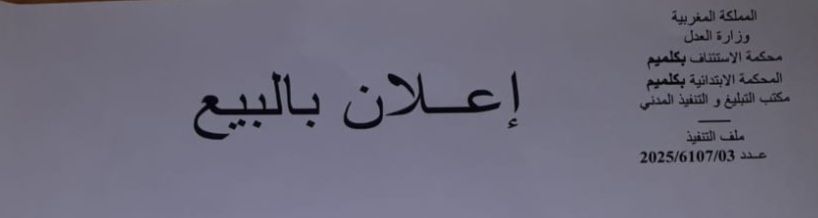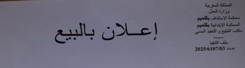 يعلن رئيس كتابة الضبط بالمحكمة الابتدائية بكلميم، أنه سيتم بتاريخ 2025/12/30 على الساعة العاشرة صباحا بقاعة البيوعات بذات المحكمة، بيع بالمزاد العلني نصيب المدعى عليه من العقار التالي: منزل رقم 88 بزنقة سيدي الغازي شارع يوسف إبن تاشفين مساحته 145م/م مكون من مستوى سفلي، وبه طابق علوي، بالإضافة إلى سطح العقار مرتبط بشبكة الماء والصرف الصحي والكهرباء، ومحفظ تحت رقم 56/9847، كما يشعر رئيس كتابة الضبط كل من رسا عليه المزاد سيؤدي 3% كإضافة على السعر لفائدة الخزينة العامة للمملكة، وللمزيد من المعلومات بالقسم المدني للتنفيذ بذات المحكمة.