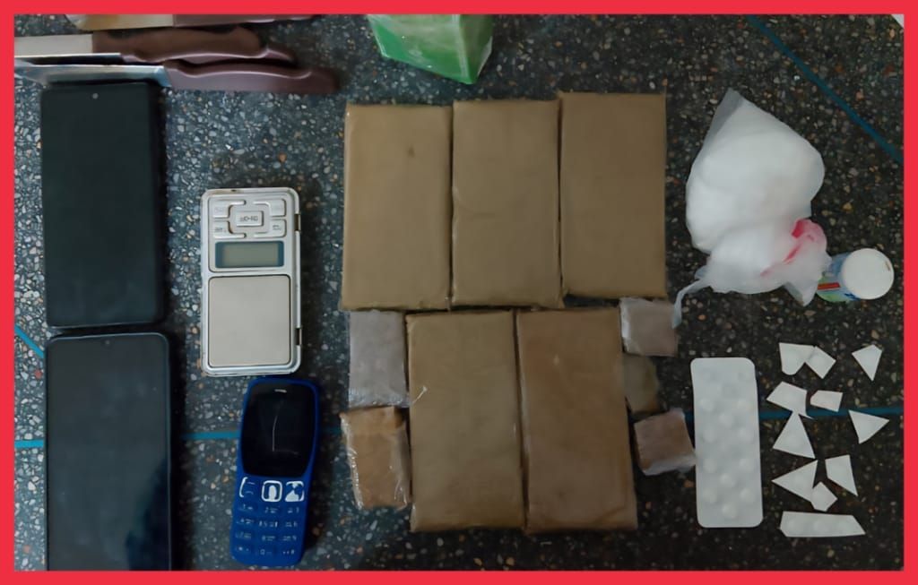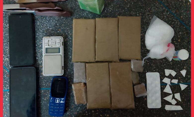 وأدت عمليات التفتيش التي أجريت بمنزل المشتبه فيه الرئيسي، بمساعدة كلاب الشرطة المدربة، إلى حجز 481 غراما من مخدر الشيرا، وحوالي أربعة كيلوغرامات من نبات القنب الهندي، بالإضافة إلى 25 قرصا طبيا مخدرا من نوع “ريڤوتريل”، و190 غراما من مسحوق أبيض يشتبه في كونه مخدر الكوكايين، علاوة على ميزان إلكتروني وسكاكين مخصصة لتقطيع المخدر.