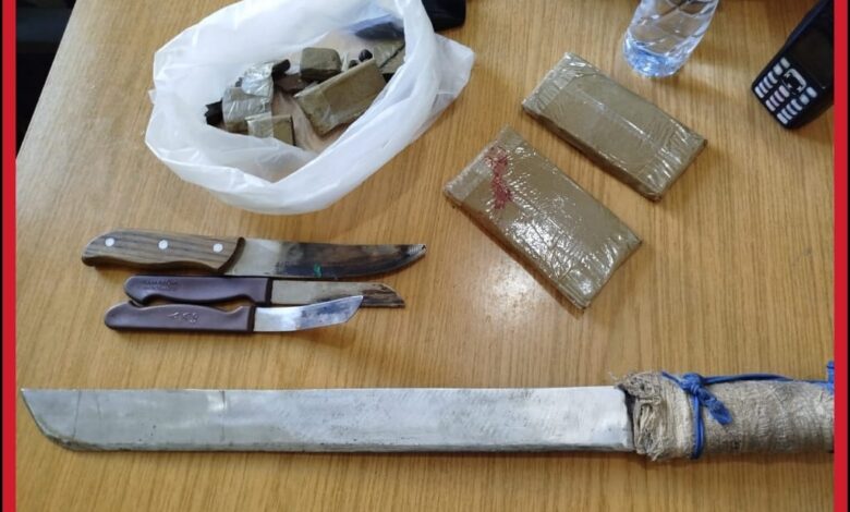 وأضاف المصدر ذاته أنه تم إجراء تفتيش دقيق بمسكن المشتبه فيه، بمؤازرة الكلاب المدربة التابعة للشرطة، حيث أسفرت العملية عن توقيف المشتبه فيه الثاني، إلى جانب حجز قطع إضافية من مخدر الشيرا، وسلاح أبيض كبير الحجم تقليدي الصنع، فضلاً عن ثلاثة سكاكين صغيرة تُستعمل في تقطيع المخدرات.