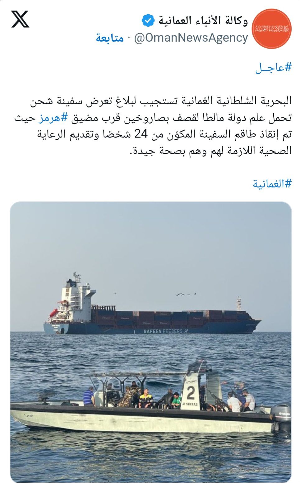 وأفادت وكالة الأنباء العمانية بأن البحرية السلطانية العُمانية استجابت لبلاغ يفيد بتعرّض سفينة شحن ترفع علم مالطا لقصف بصاروخين أثناء إبحارها بالقرب من المضيق، دون أن توضح في بيانها الأولي حجم الأضرار أو ما إذا سُجّلت إصابات بين طاقم السفينة.