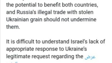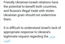 وأضاف الوزير الأوكراني أن بلاده تجد صعوبة في تفهم ما وصفه بـ”عدم الاستجابة المناسبة” من جانب إسرائيل لطلبها المشروع بشأن سفينة سابقة وصلت إلى ميناء حيفا محمّلة ببضائع يعتقد أنها مسروقة. وتابع قائلًا إن وصول سفينة أخرى من النوع ذاته يدفع كييف إلى تحذير إسرائيل من احتمال الإضرار بمستوى العلاقات بين البلدين.