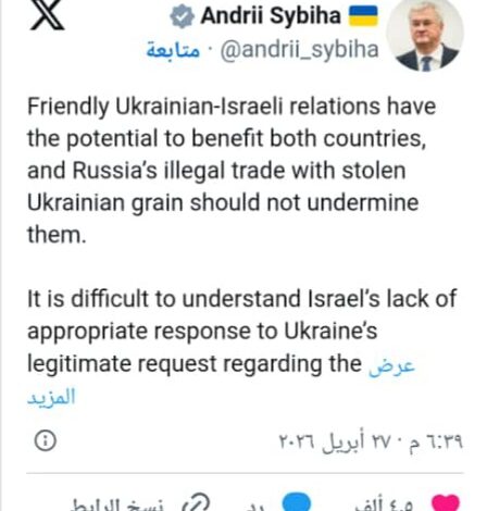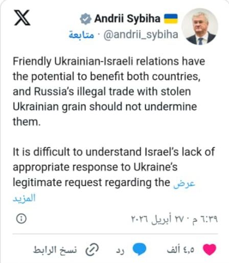 وأعلن وزير الخارجية الأوكراني أندريه سيبيها، في منشور باللغة الإنجليزية عبر منصة “إكس”، أن بلاده تعتزم تقديم مذكرة احتجاج رسمية للسفير الإسرائيلي، ردًا على ما وصفه بسماح إسرائيل بدخول شحنات من الحبوب “المسروقة” من الأراضي الأوكرانية.