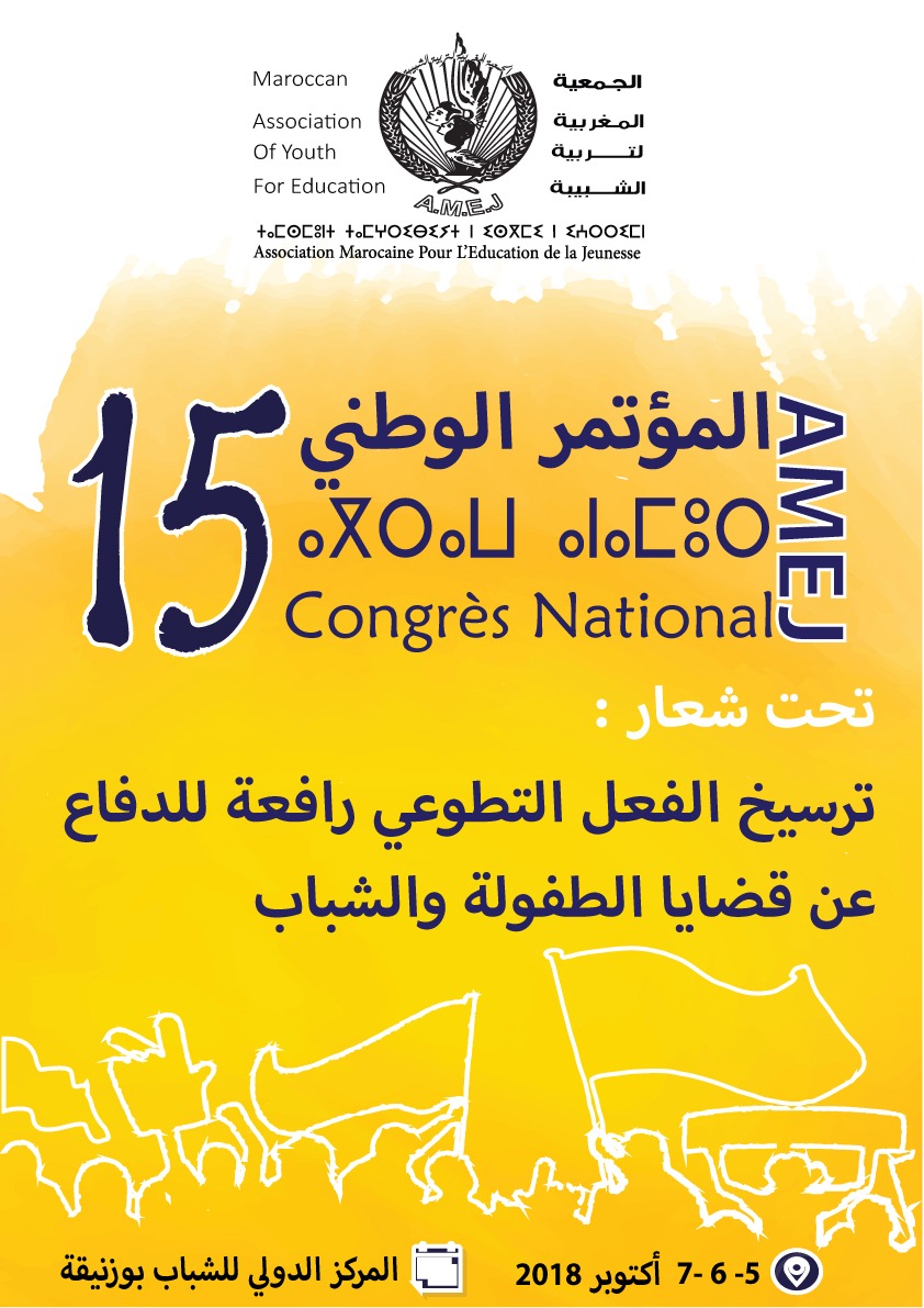 تنظم الجمعية المغربية لتربية الشبيبة ( AMEJ )،مؤتمرها 15 تحت شعار ” ترسيخ العمل الفعل التطوعي رافعة للدفاع عن قضايا الطفولة والشباب ” وذلك خلال أيام 5/6/7 أكتوبر 2018 بالمركز الدولي للطفولة والشباب بمدينة بوزنيقة ، و حسب القائمين على هذا المؤتمر فإنه من المرجح مشاركة حوالي 300 مشارك،كما سينكبون على مناقشة حصيلة وإستراتيجية الاشتغال للجمعية خلال السنوات الأربع الماضي ، فيما سيتدارس المؤتمرين داخل للجن الأربع مشاريع المؤتمر ( ورقة التربية والثقافية ) ولجنتي مقاربة النوع والقوانين .