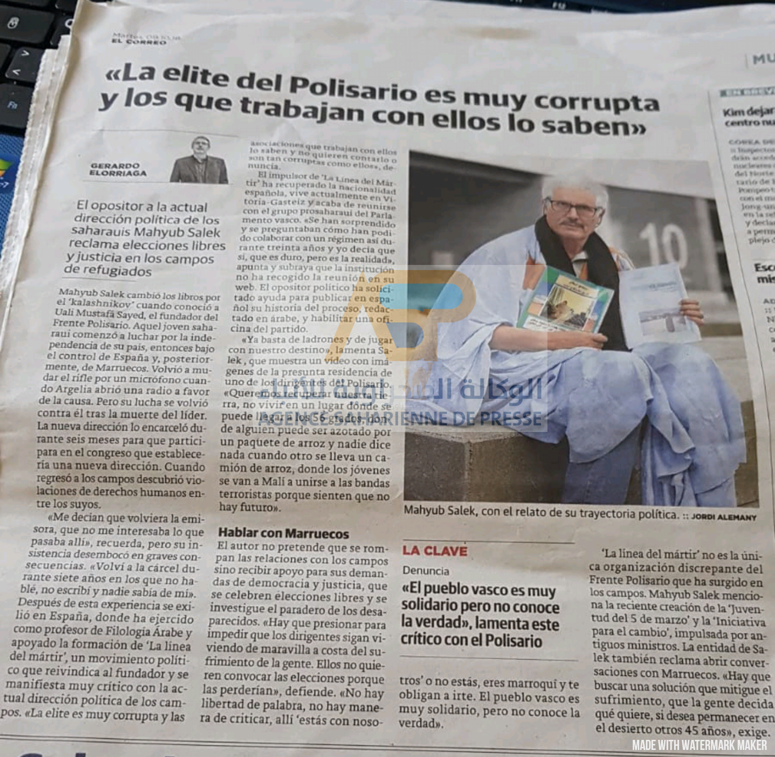 ،هذا هو العنوان الذي عنونت به جريدة (EL CORREO) الصادرة باللغة الإسبانية بالديار الإسبانية خلال مقابلة مع زعيم تيار الماعارض لجبهة البوليساريو خط الشهيد “الجفاف السالك” هذا العنوان الذي خلق هيستيريا كبيرة على مستوى ممثلي جبهة البوليساريو بإسبانيا و ردود فعل كبيرة في أوساط مخيمات تندوف و كذلك بين الموالين و الداعمين ثم المتعاطفين مع قيادة جبهة البوليساريو هذا اللقاء الذي تناول من خلالها (الجفاف السالك)مراحل نضاله في جبهة البوليساريو،كما تناول الوضع الحالي بالصحراء، مؤكدا في نفس الوقت بأن الثورة التي كانت تقودها ثلة من قيادة البوليساريو قد تحولت إلى تجارة تعيش على عائداتها قيادة البوليساريو الحالية، مما جعلها تكون مرتشية و فاسدة و غير ديمقراطية،و لا تسمح بالتعبير و لا حرية الرأي و لا الإنتخاباتالحرة و النزيهة،كما تناول مع الجريدة الإسبانية لقائه مع البرلمان الباسكي، و الذي وضعهم في الصورة الحقيقية لقيادة البوليساريو، مؤكدا لهم أن جل التيارات المعارضةلجبهة البوليساريو من خط الشهيد،مرور بحركة الشباب 5 مارس وصولا إلى مبادرة التغيير التي يتزعمها وزراء كانوا بقيادة البوليساريو، لم يجدوا من قيادة البوليساريو سوى التخوين و الإتهامات الجوفاء،نتيجة الفساد المستشري في القيادة واصفا إياها بالمرتشية،مؤكدا أن كل جمعيات المجتمع المدني التي تتعامل مع قيادة البوليساريو إما أنها تغض الطرف عن هذه القيادة أم أنها تتشارك معها في فسادها.