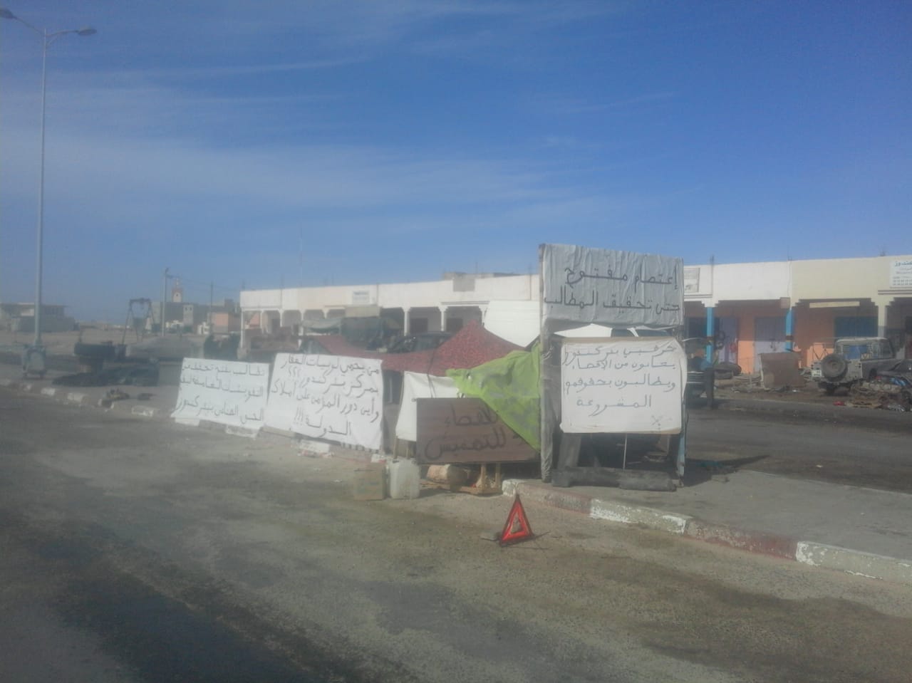 لا يزال بعض الحرفيين بجماعة بئر كندوز حيث يوجد مقر عمالة أوسرد التي تقع جنوب مدينة الداخلة بحوالي 280كلم، معتصمين بإحدى الخيام التي نصبوها بالقرب من الطريق الوطنية رقم 1 الرابطة بين الجماعة و نقطة العبور الكركرات هذا الإعتصام الذي قالت عنه مصادر من عين المكان أنه نظم منذ حوالي أسبوع،نتيجة الوعود التي قطعها رئيس الجماعة على نفسه بعدما نظم هؤلاء الحرفيين وقفة في وقت سابق قدرته لمصادر بحوالي شهرين الشيء الذي جعل هؤلاء الحرفيين يعودون من جديد إلى الإعتصام مطالبين من خلال يافطات تم تثبيتها بالقرب من خيمة الإعتصام بضرورة فتح تحقيق في التفويتات الغامضة الحي الصناعي بجماعة بئركندوز . هذا في الوقت الذي تحدثت مصادر الجريدة عن منح الألف الأمتار لبعض المسؤولين و ذوي النفوذ في الوقت الذي كان بإمكان المسؤول الأول عن الإقليم العناية بهؤلاء الحرفيين الذين الذين يساهمون في تنمية إقتصاد الجماعة و المنطقة لكن لا حياة لمن تنادي.
