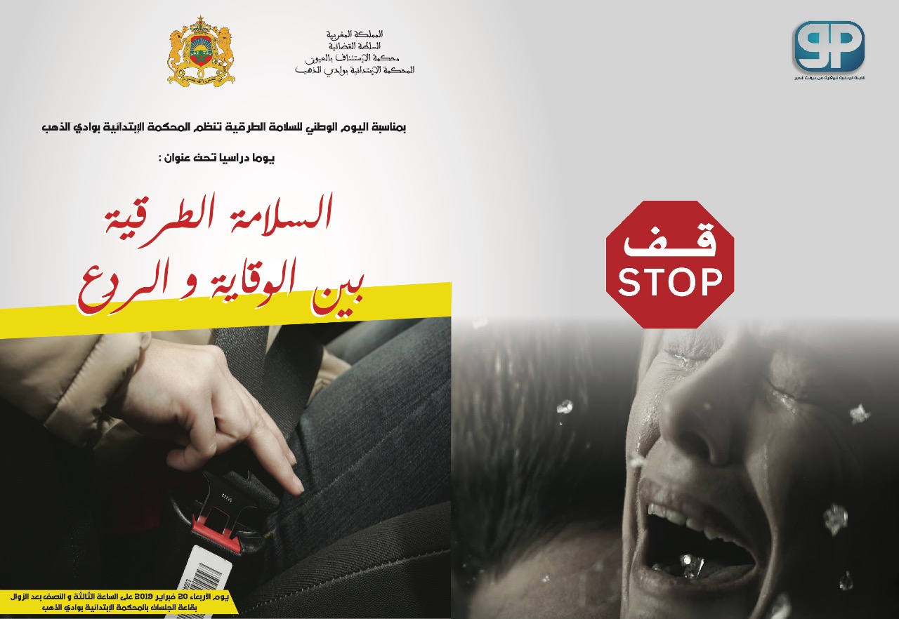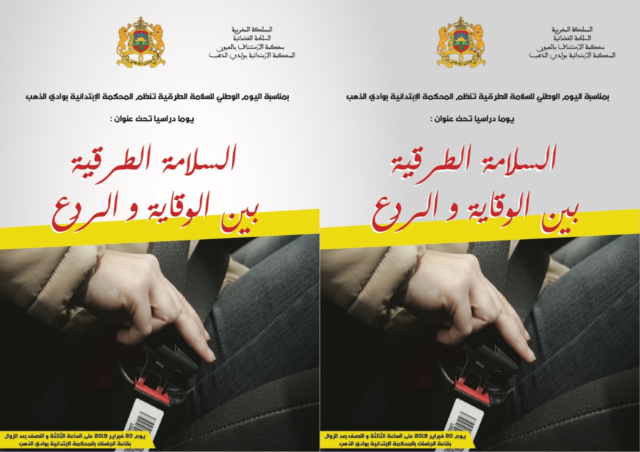 بمناسبة اليوم العالمي للسلامة الطرقية تنظم المحكمة الإبتدائية يوم دراسي تحت شعار”السلامة الطرقية بين الوقاية و الردع” هذا اليوم الذي تم تأطير من طرف ثلة من رجال القضاء كوكيل الملك و رئيس المحكمة بالداخلة،بالإضافة إلى مداخلة كل من نائب وكيل الملك بذات المحكمة الذي تناول في مداخلة له دور النيابة العامة في تحقيق السلامة الطرقية، كما تطرق أحد القضاة في نفس السياق إلى دور القضاء في السلامة الطرقية، أما مسالة المقاربة الأمنية في محال السلامة الطرقية فقد جاءت مداخلة من طرف رئيس الهيئة الحضرية بالمنطقة الأمنية بالداخلة،كما تناول مندوب وزارة الصحة قضية الإصابات الناجمة عن حوادث السير مديلا الموضوع بإحصائيات حصيلة سنة 2018 بجهة الداخلة وادي الذهب،كما تناولت أكاديمية التربية الوطنية بذات الجهة قضية السلامة الطرقية من الجانب التربوي،هذا في الوقت الذي ذكرت فيه إحدى جمعيات المجتمع المدني بدور المجتمع المدني في التوعية بالسلامة الطرقية،أما مداخلة وزارة التجهيز في هذه المناسبة فقد تمحورت حول إستراتيجية الوزارة في السلامة الطرقية.
