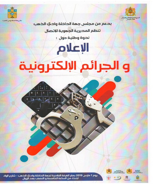 شهدت قاعة الندوات بالغرفة الفلاحية بجهة الداخلة وادي الذهب، يوم الجمعة فاتح مارس 2019 ، ندوة وطنية حول الإعلام و الجرائم الالكترونية، تم تنظيمها من طرف المديرية الجهوية للاتصال، وذلك بدعم من مجلس جهة الداخلة وادي الذهب و بشراكة مع ولاية جهة الداخلة و المحكمة الابتدائية بوادي الذهب و اللجنة الجهوية لحقوق الانسان الداخلة أوسرد بالإضافة الى كليتي الاداب والعلوم الانسانية بوجدة و فاس، و قد كان موضوع “مستجدات قانون الصحافة والنشر في شقه المتعلق بالصحافة الإلكترونية”،الذي كان كمداخلة لوكيل الملك بالمحكمة الابتدائية بالداخلة،أما مدير مختبر صناعة الثقافة و الإتصال التابع لكليتي الآداب و العلوم الإنسانية بوجدة فقد شارك بمداخلة تحت عنوان” الإشاعة الإلكترونية و خطرها على السلم الإجتماعى”، هذه المواضيع التي كانت في غاية الأهمية و تتبعها العديد من المهتمين بما فيهم أصحاب بعض المواقع الإلكترونية.